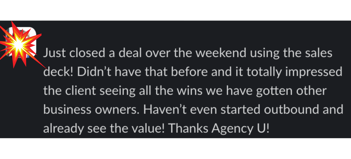 Agency U is designed by agency owners for agency owners. Our team is compromised our co-founders who are owners of 7 figure agencies who started their agencies in 2018. Most agency programs will usually be either lead generation focused or talent acquisition/systems focused. Agency U is a program that covers all 9 levers to grow your agency which are: Client Acquisition System, Sales Infrastructure, Agency Operating System, Agency Authority, Talent Acquisition System, Becoming A CEO, Agency Finance Mastery, 7 Figure Agency Mindset, and Productized & Scalable Offer